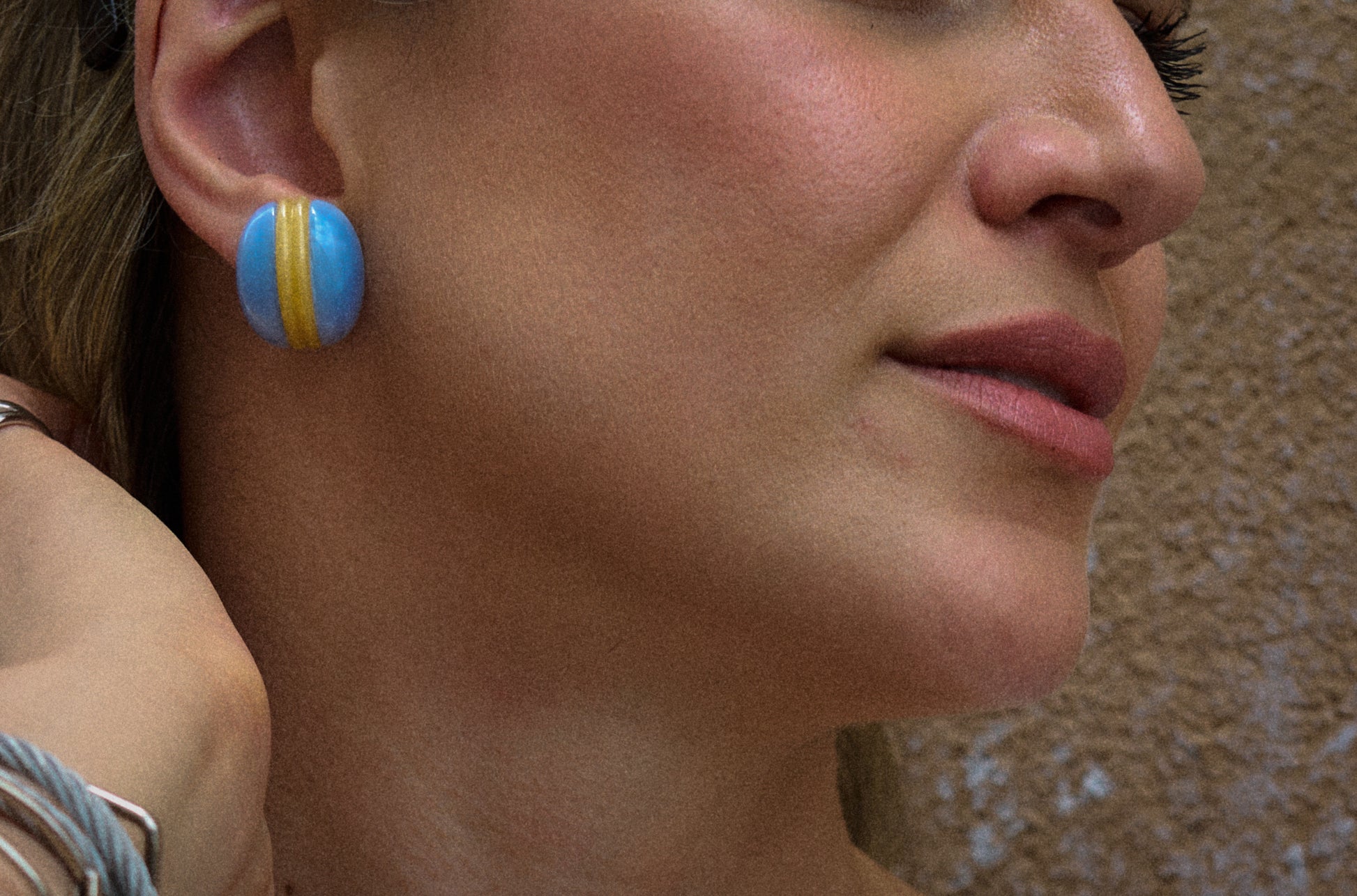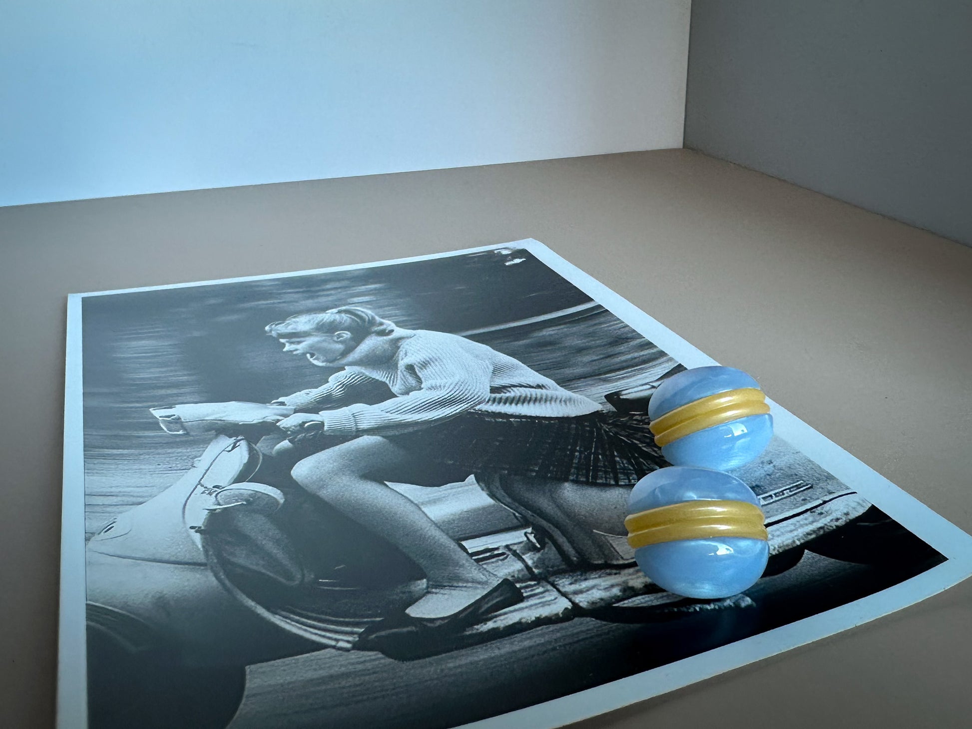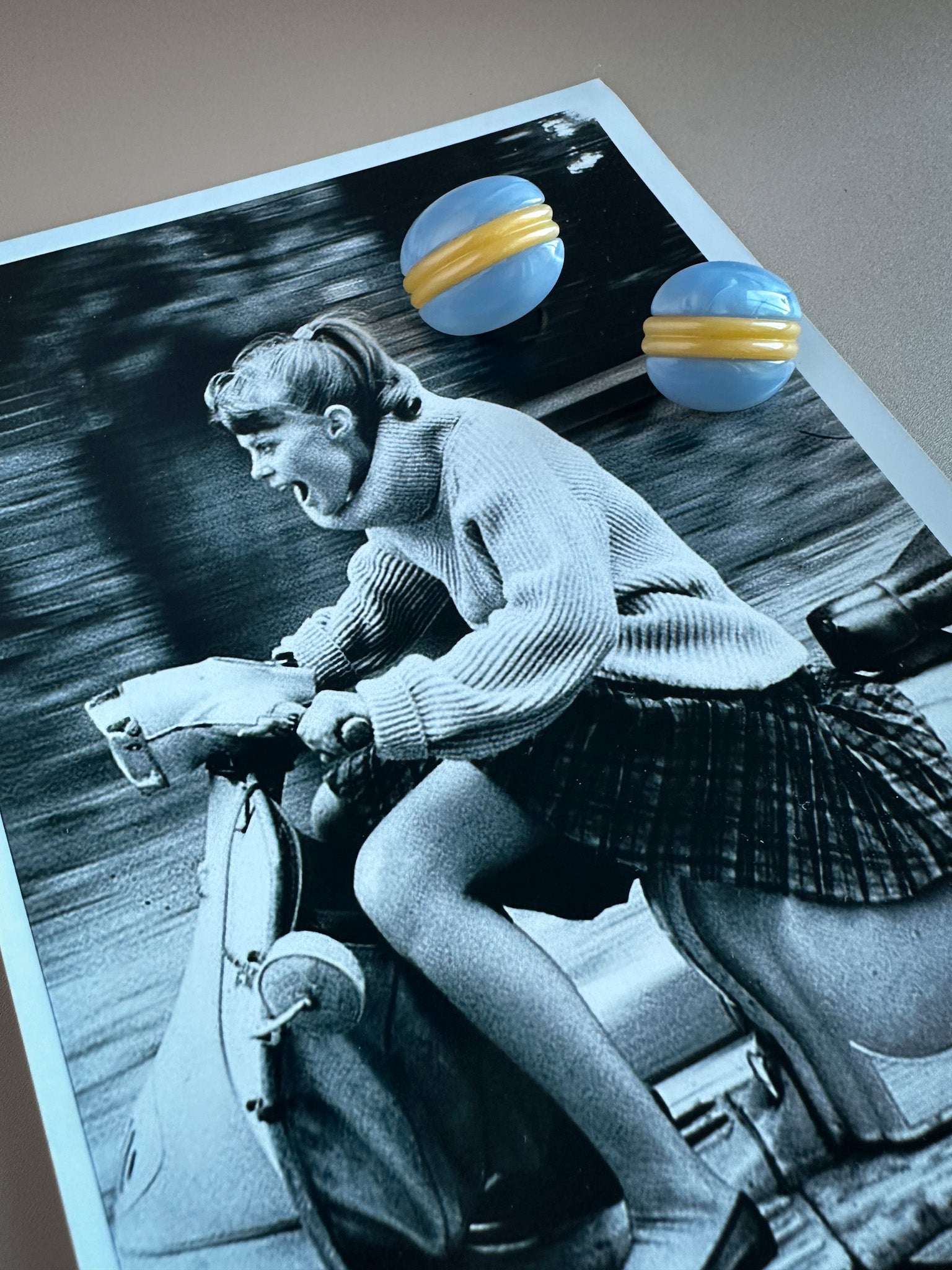 Playful and bold, these 1960s mod-inspired clip-on earrings are a vibrant throwback to the golden age of pop fashion. Crafted in a glossy sky-blue acrylic with a cheerful lemon-yellow stripe detail, their rounded button shape makes them the perfect finishing touch for any retro lover’s collection. Lightweight and fun, they pair beautifully with a colorful scarf or minimalist outfit for maximum impact.