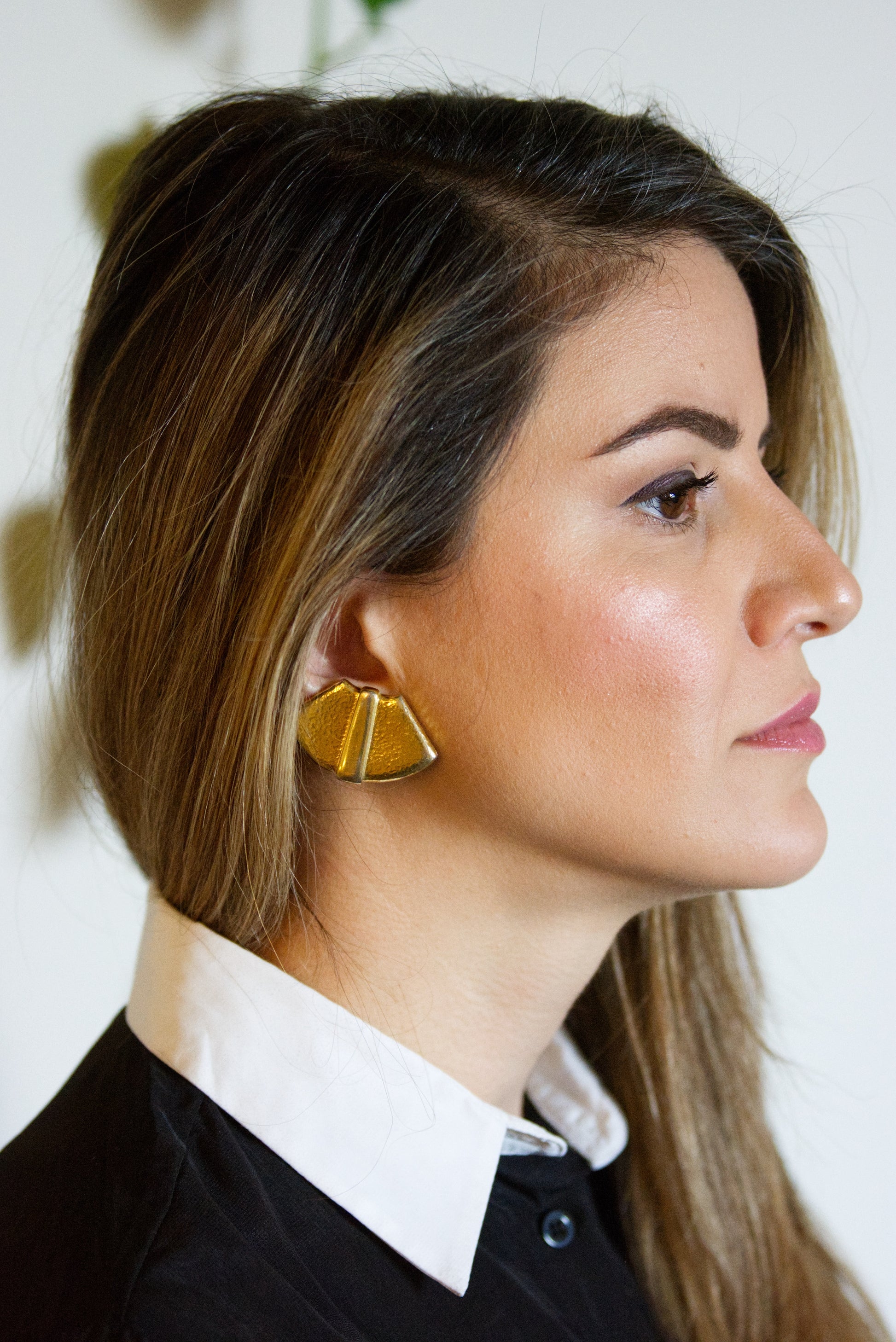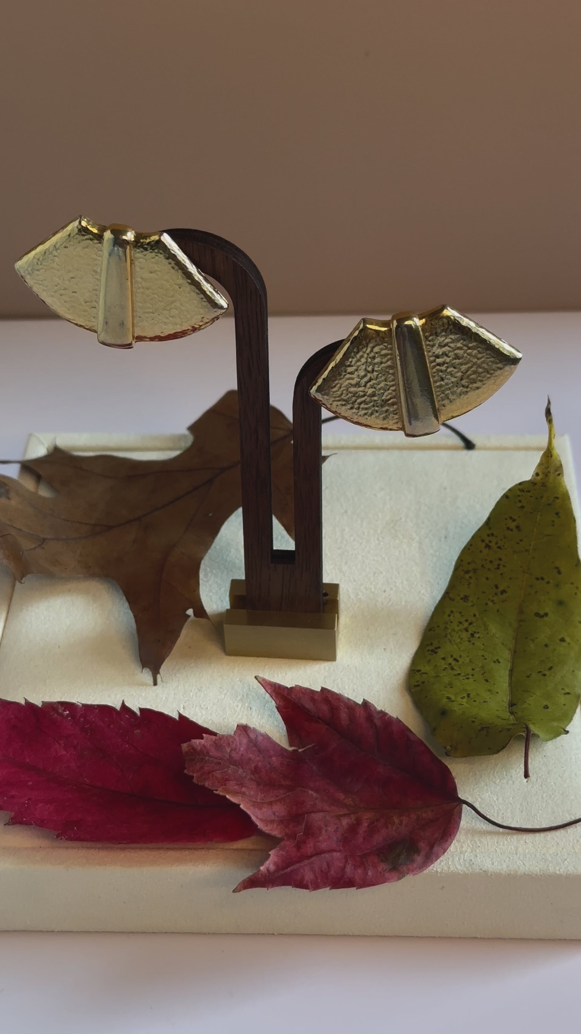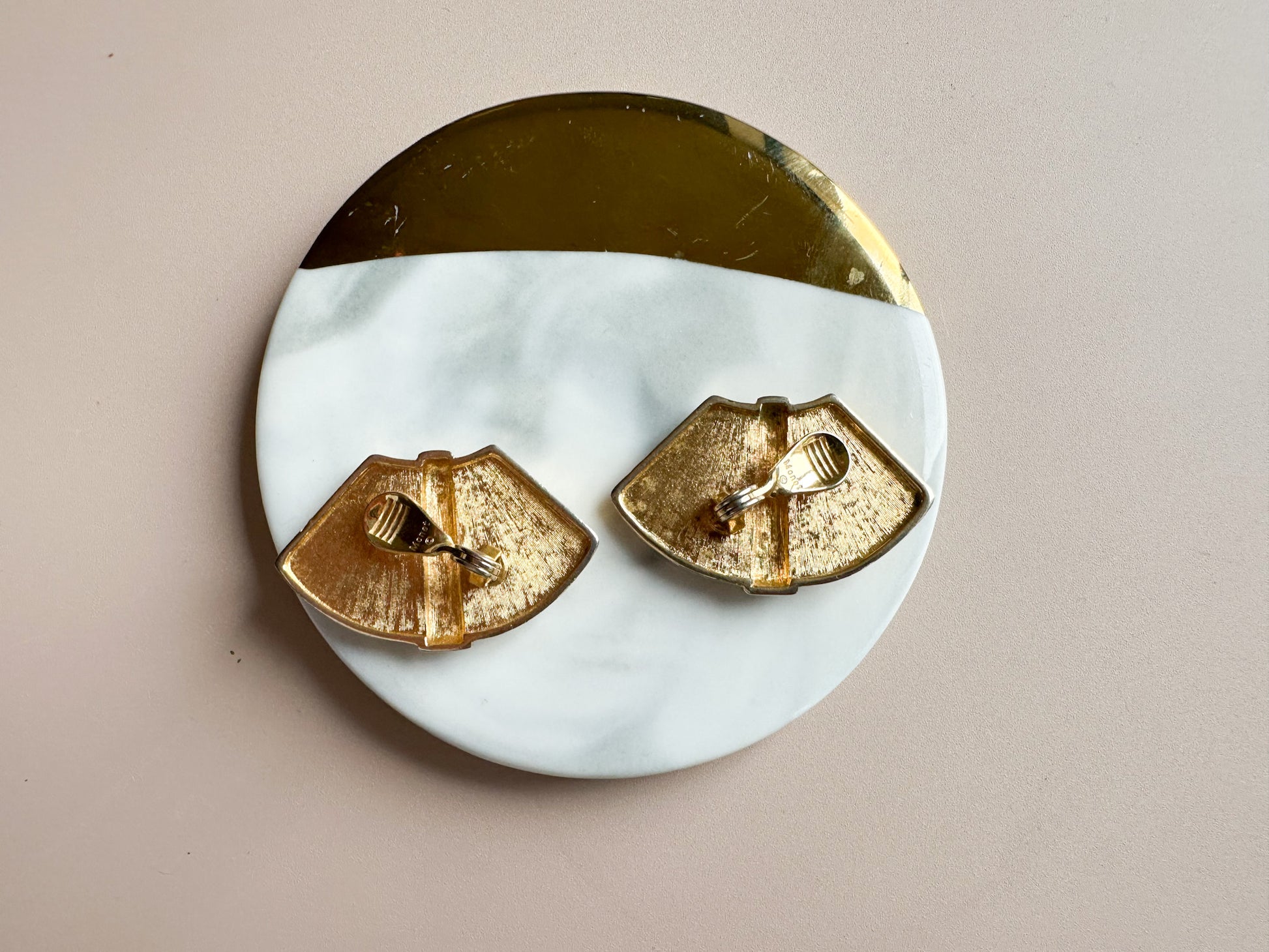A stunning example of bold 1980s design, these vintage Monet earrings feature a fan-like sculptural shape in a richly textured gold-tone finish. The architectural silhouette adds a powerful yet elegant touch, making them a striking accessory for day or night. Finished with secure clip-on backs, these earrings are perfect for non-pierced ears and vintage lovers alike.