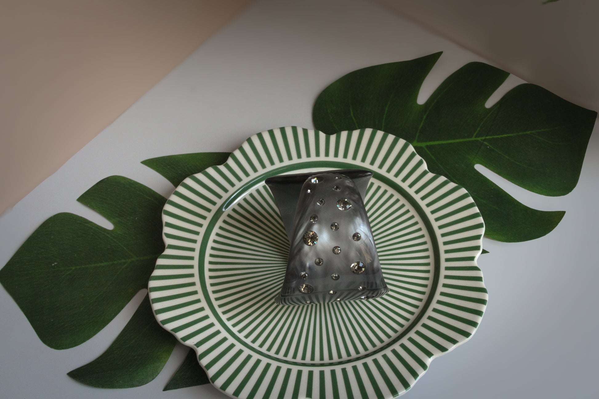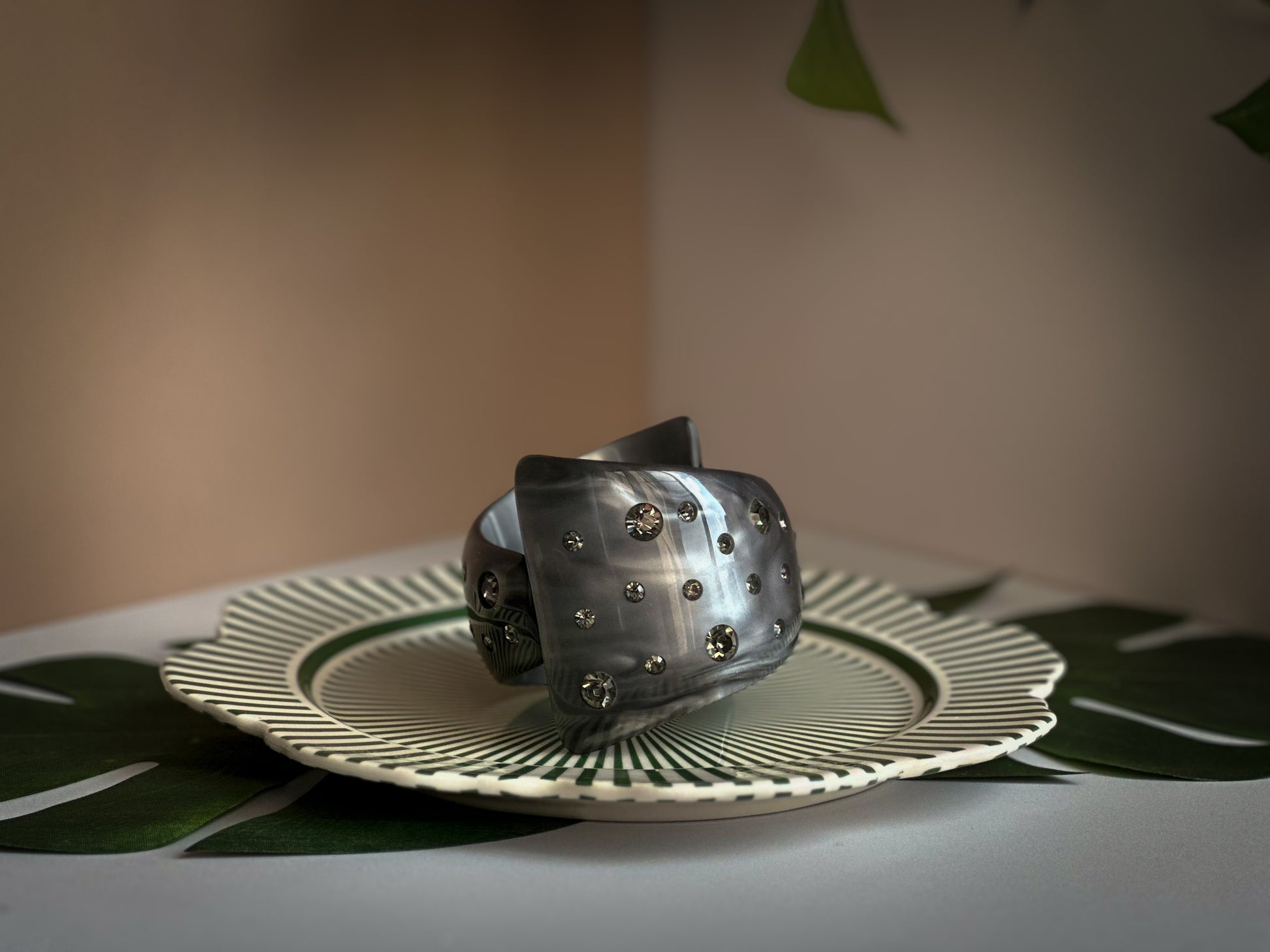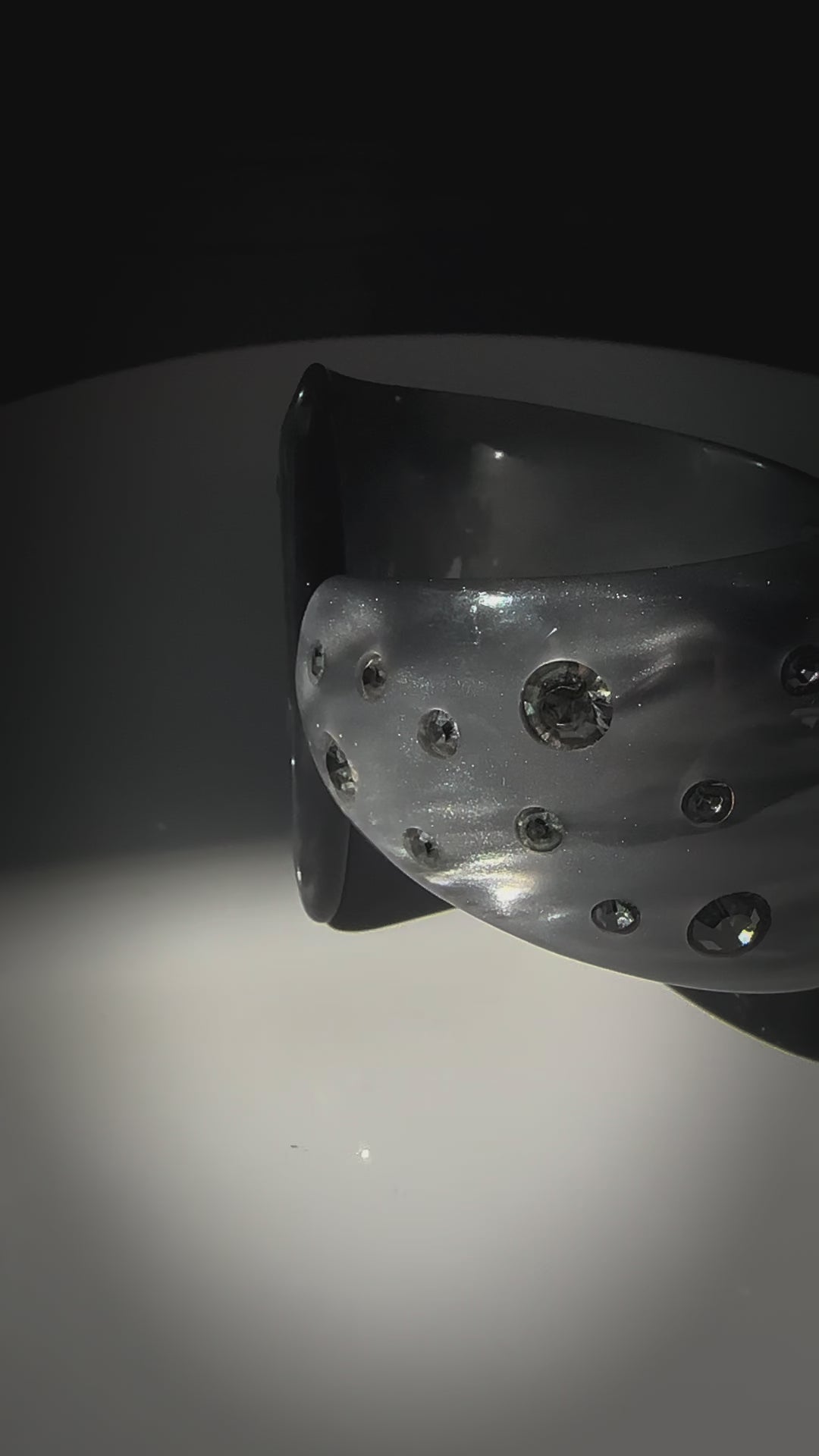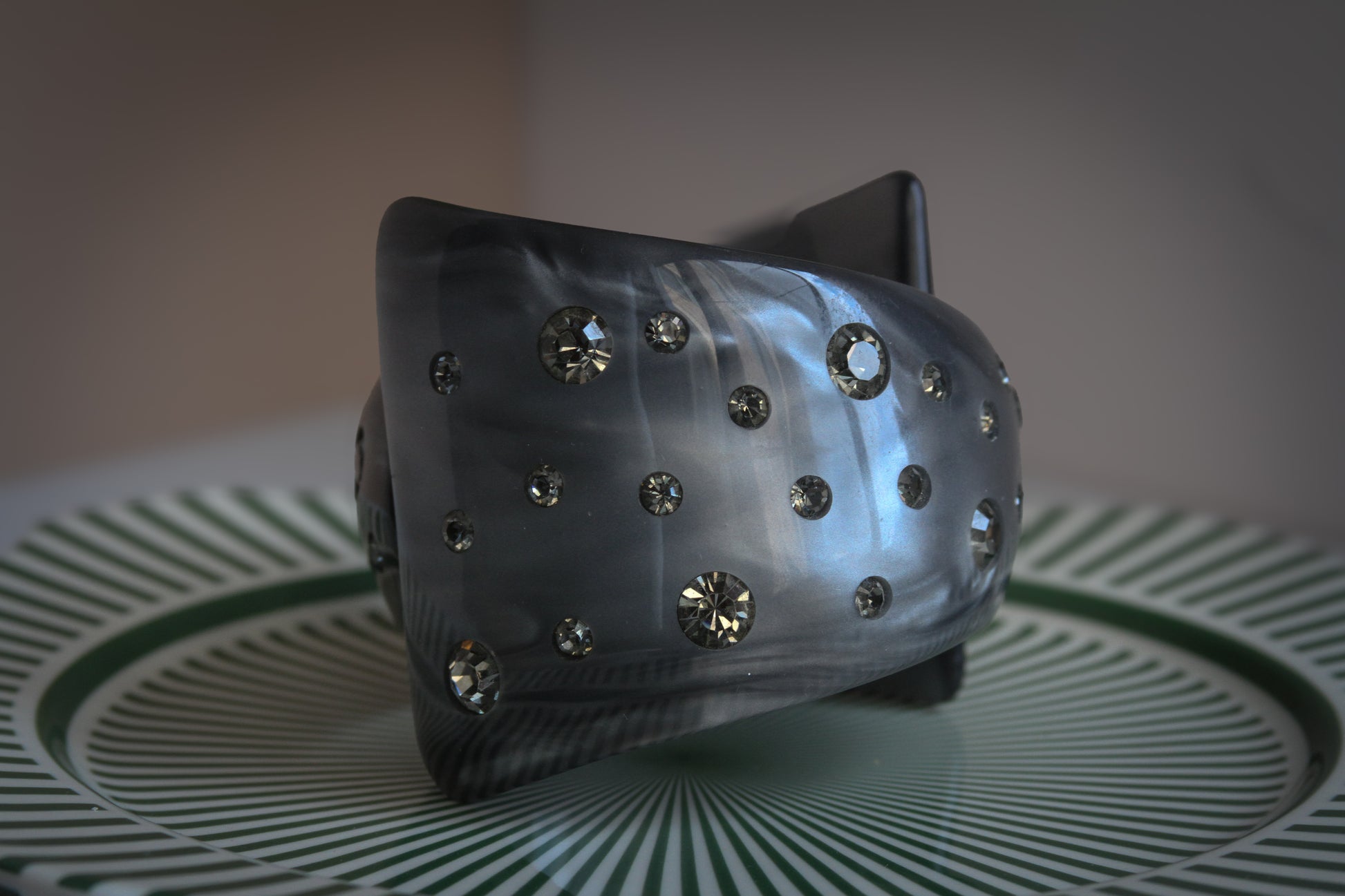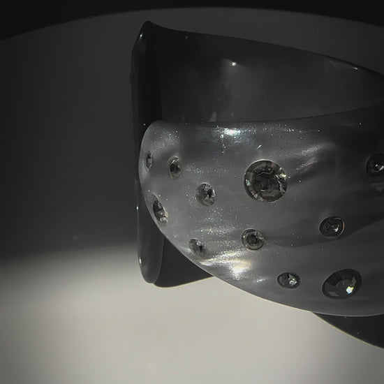 Color: Marbled gray Lucite with clear rhinestones