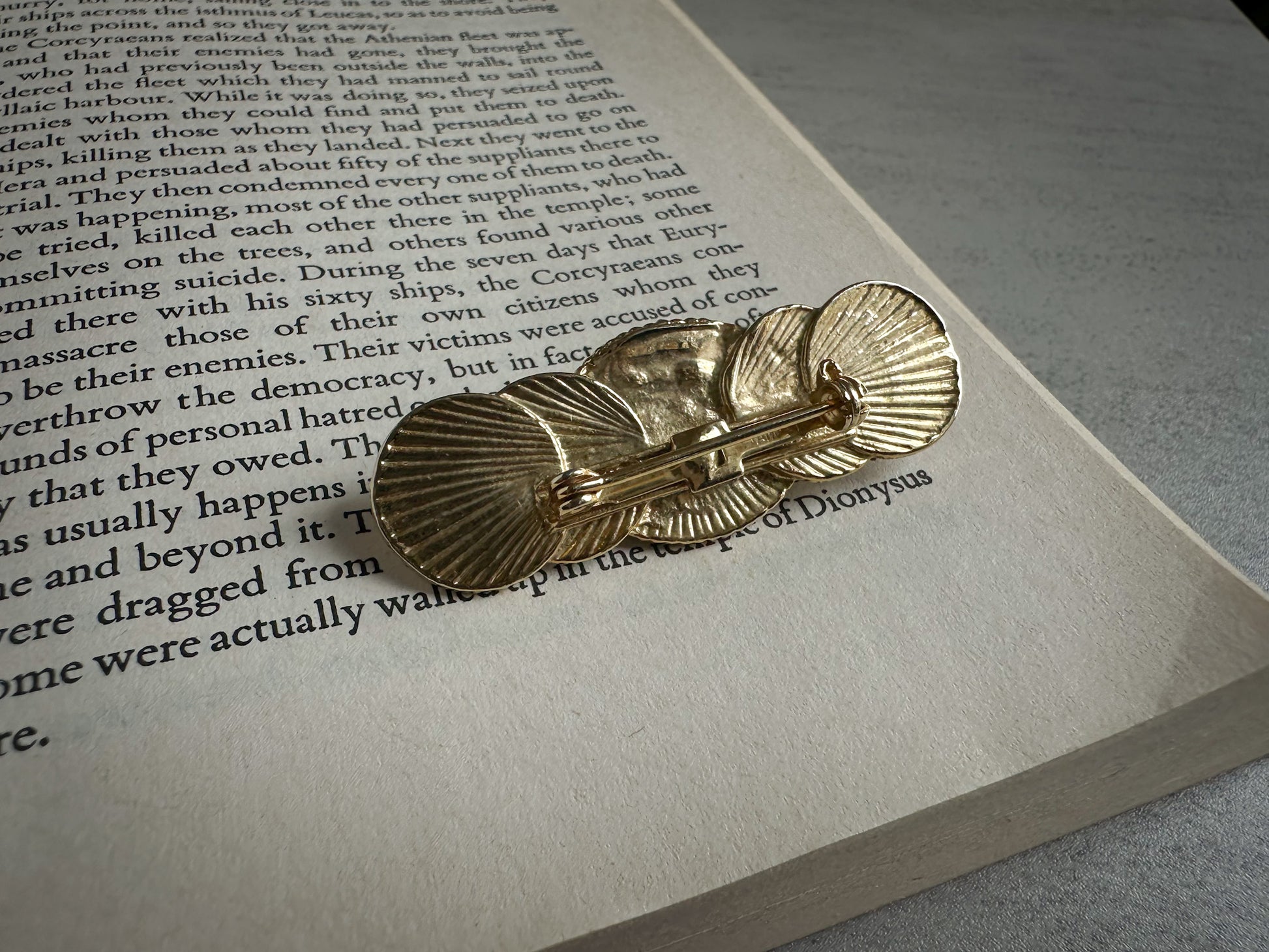 This vintage-style brooch features a captivating celestial design, with a trio of textured, radiating gold-toned disks encircling a central oval black stone. The ridged surface creates a fan-like effect that catches the light beautifully, adding depth and elegance. The black stone is polished and slightly domed, set in a delicate beaded bezel that enhances its classic appeal. The back is fitted with a secure pin clasp for easy wear on lapels, dresses, or scarves.