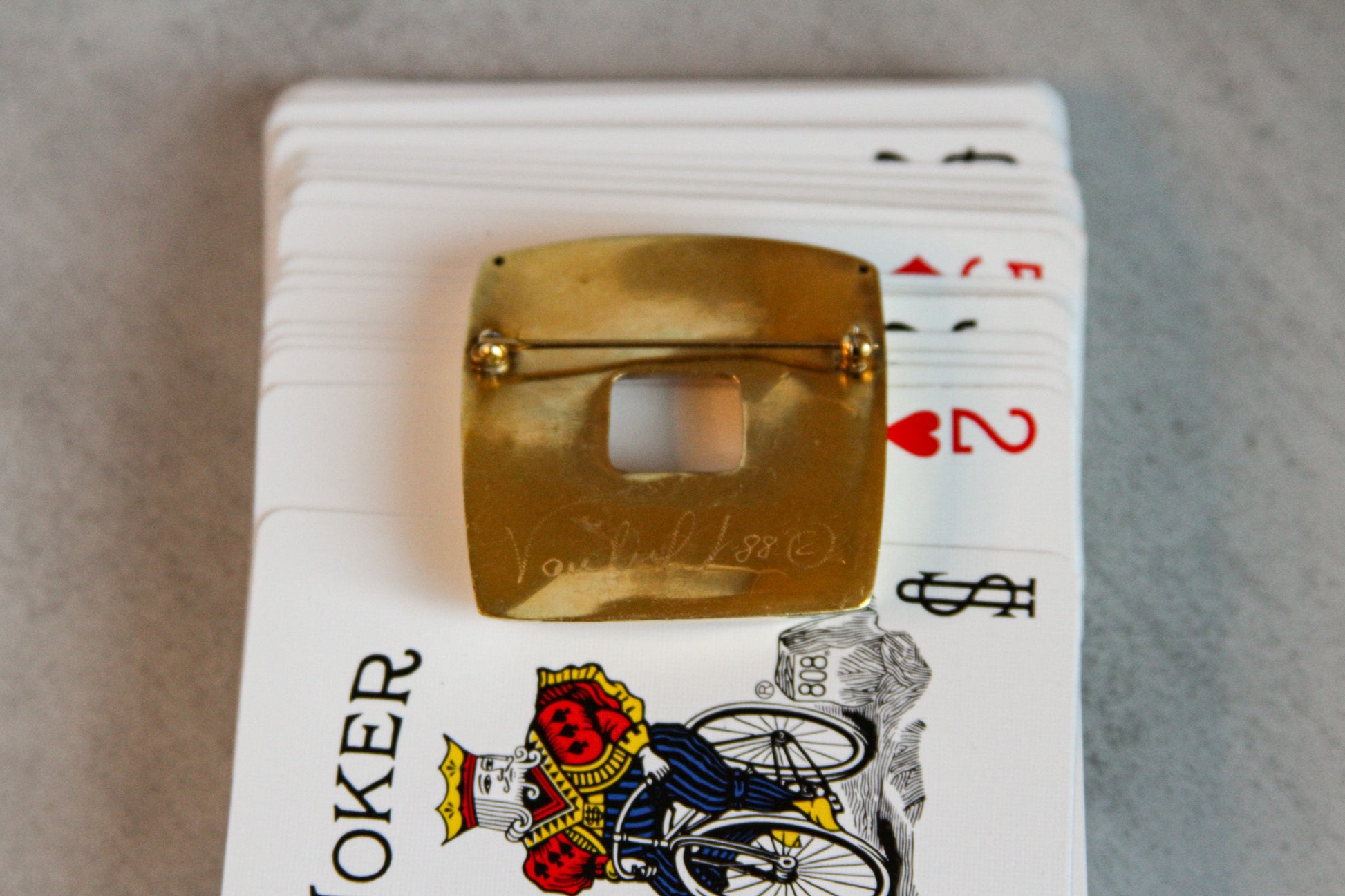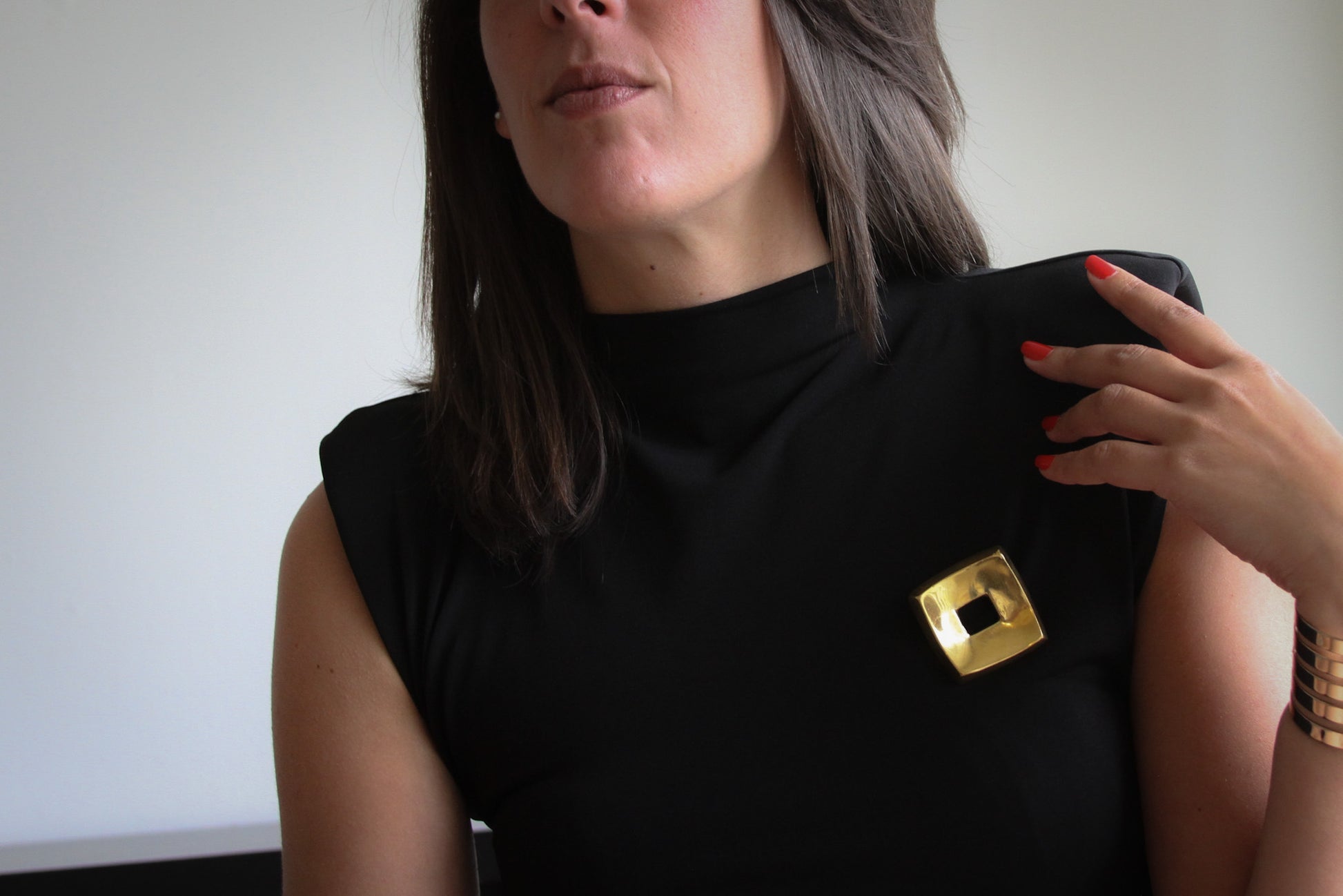 Elevate your look with this striking vintage brooch by designer Vassilakis, dated 1988. Crafted in a radiant gold-tone finish, the piece features a bold geometric design—a convex square form with a dramatic open center. The minimal yet sculptural aesthetic captures the spirit of late-1980s modernism and makes a powerful statement when pinned to a structured blouse or blazer.
