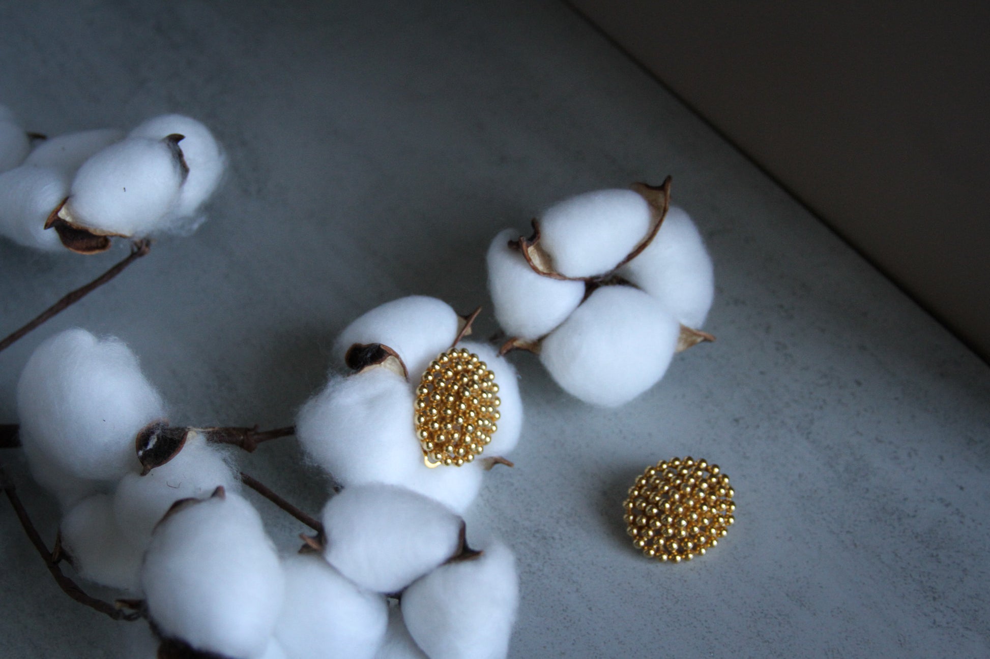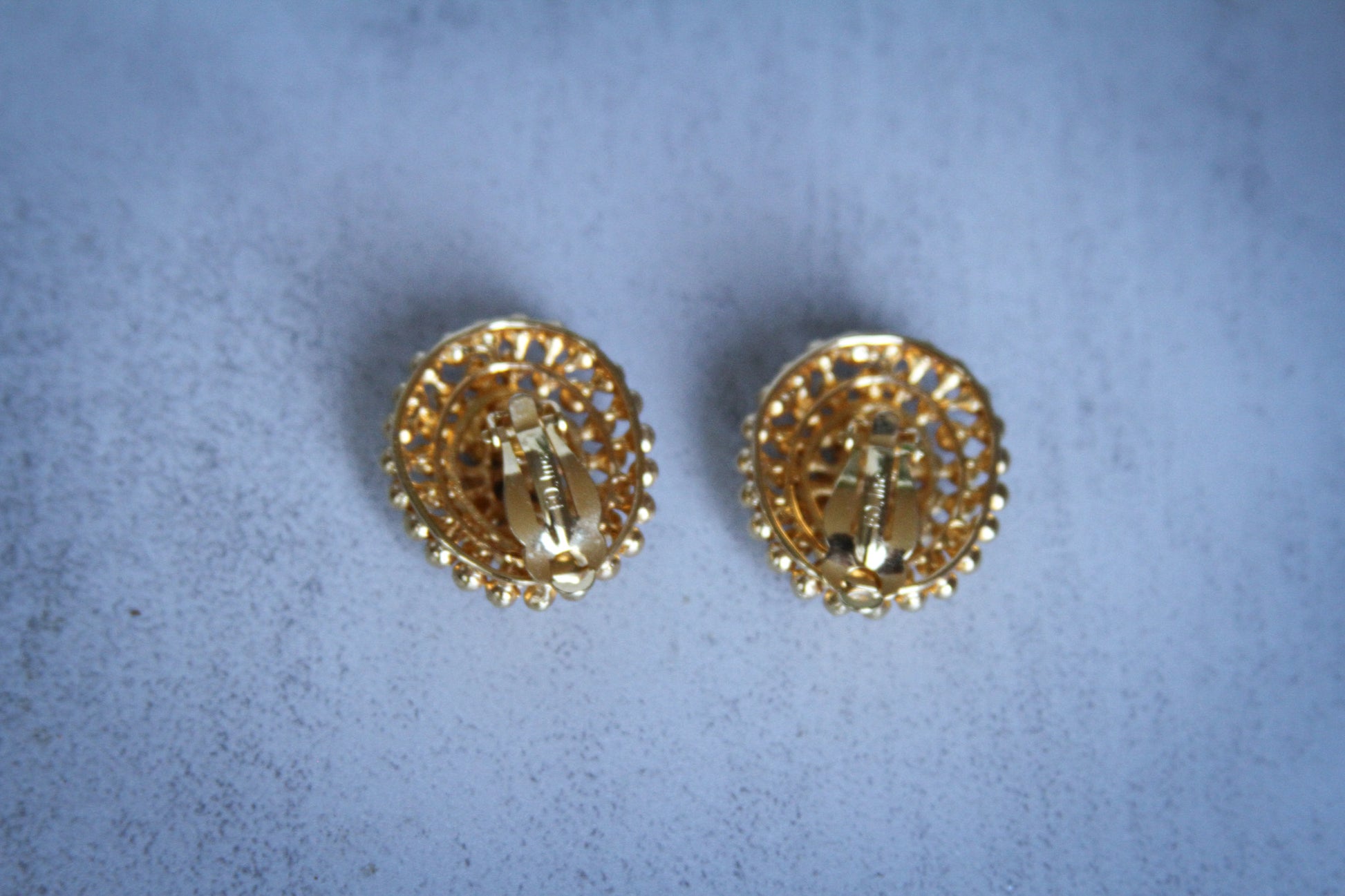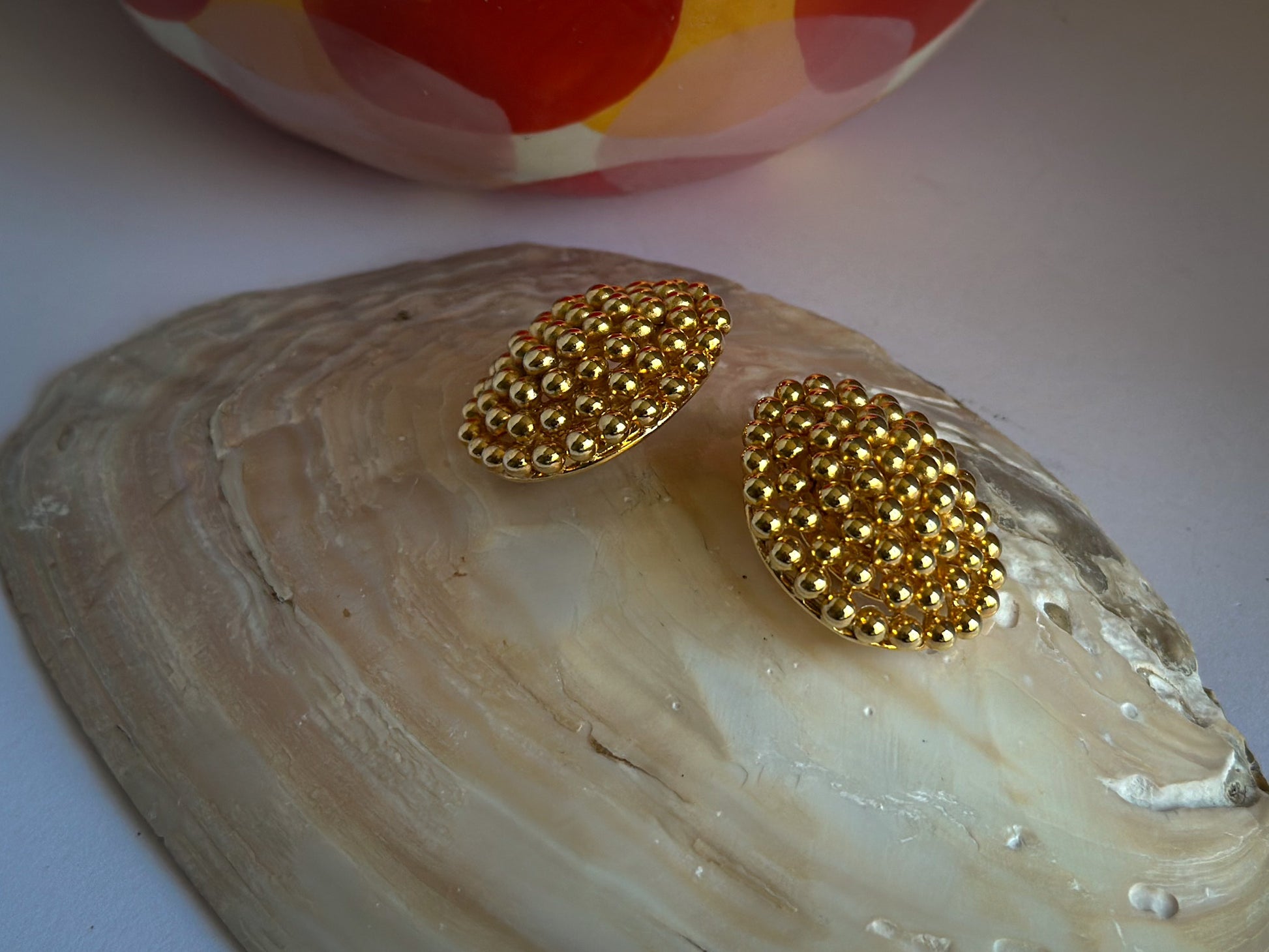 These vintage clip-on earrings feature a striking dome shape formed by clustered gold-tone beads, creating a rich, textured look with subtle dimension. Bold yet versatile, they blend mid-century glam with a contemporary flair, making them perfect for both casual and elevated looks.