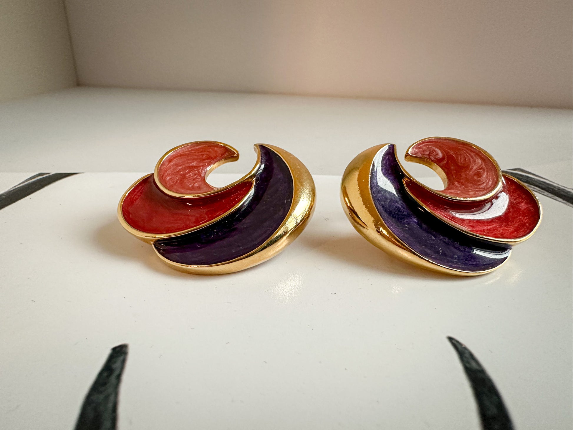 These bold and artistic vintage-style clip-on earrings feature a sculptural half-moon swirl design in rich enamel tones of marbled red and deep violet. Accented with shiny gold-tone borders, the earrings radiate 1980s glamor and expressive flair. Their fluid crescent shape hugs the ear for a striking, sculpted look — perfect for both statement wear and retro fashion lovers.