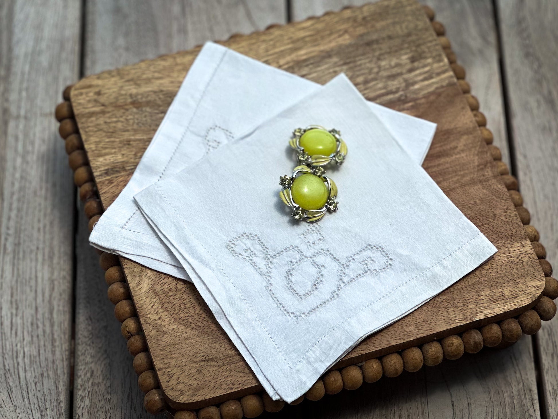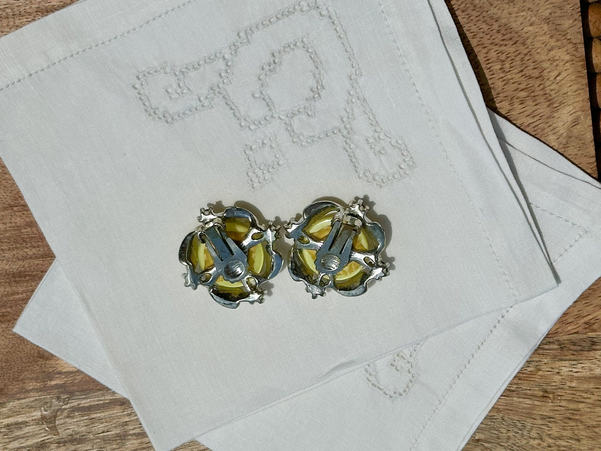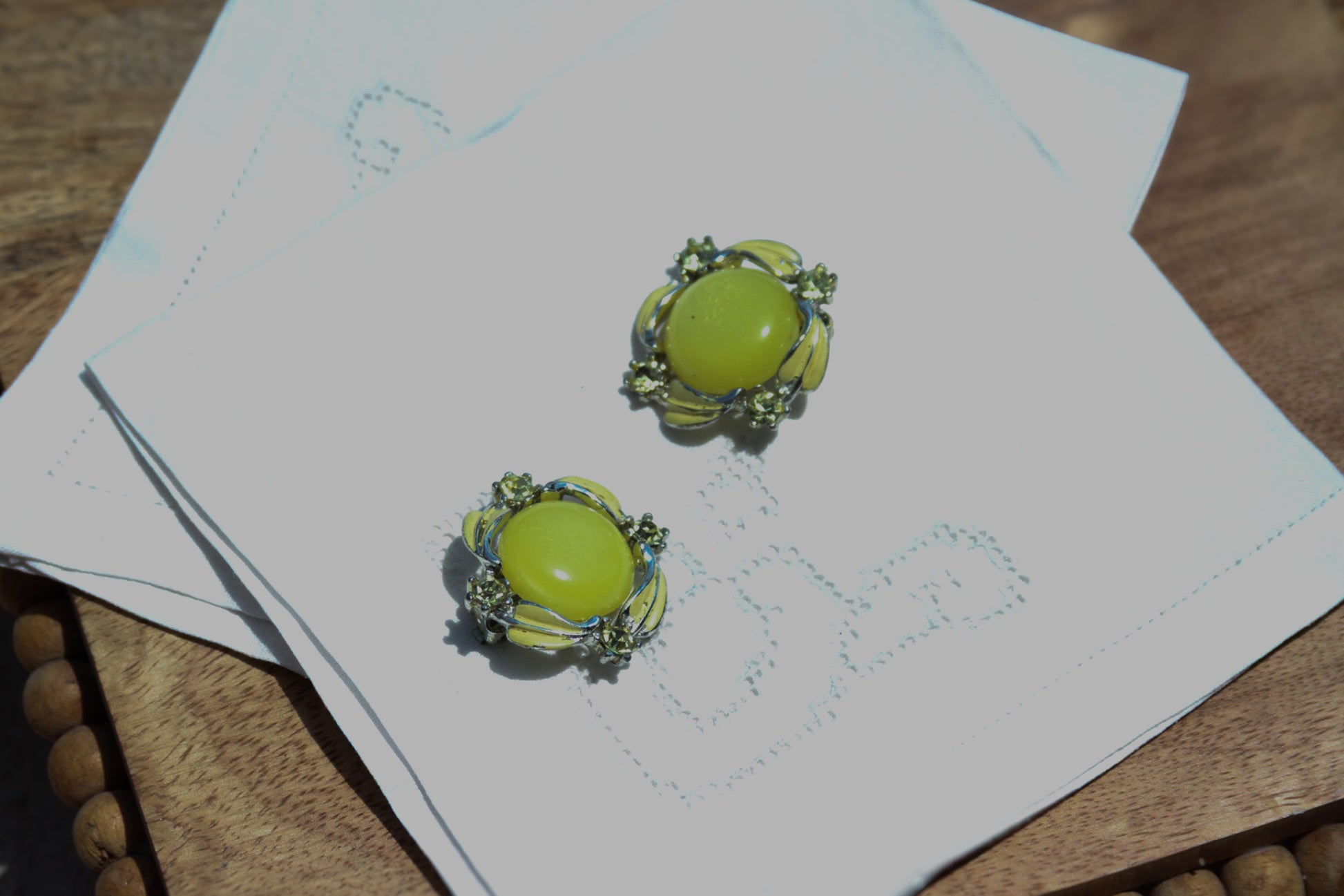 Brighten up your outfit with these joyful 1950s clip-on earrings, featuring a vibrant lemon-lime cabochon center encased in a silvertone floral frame. The petal-like accents and small green rhinestones add an eye-catching sparkle, making these earrings a true retro delight. Perfect for lovers of vintage glam or spring-inspired styling.