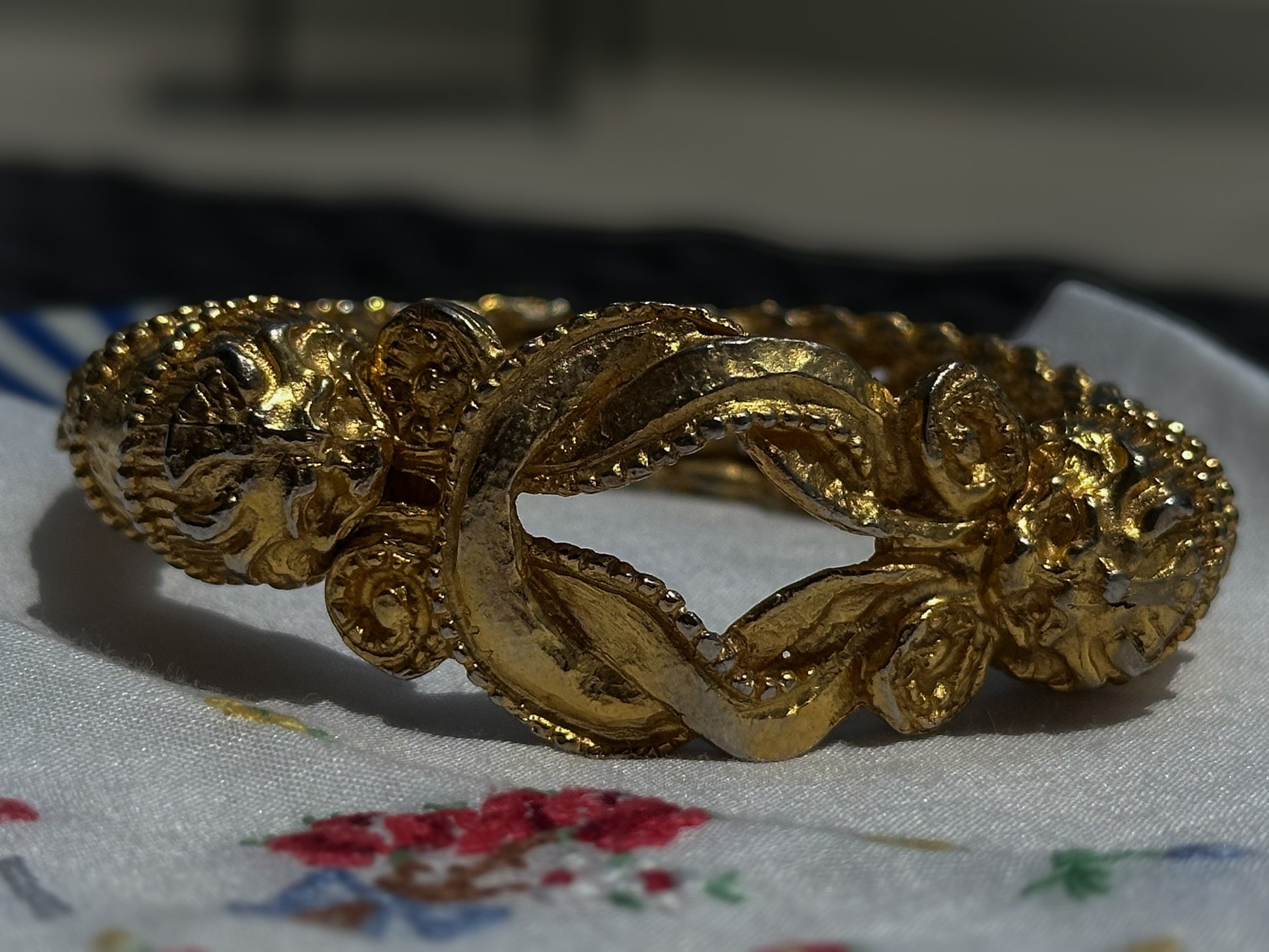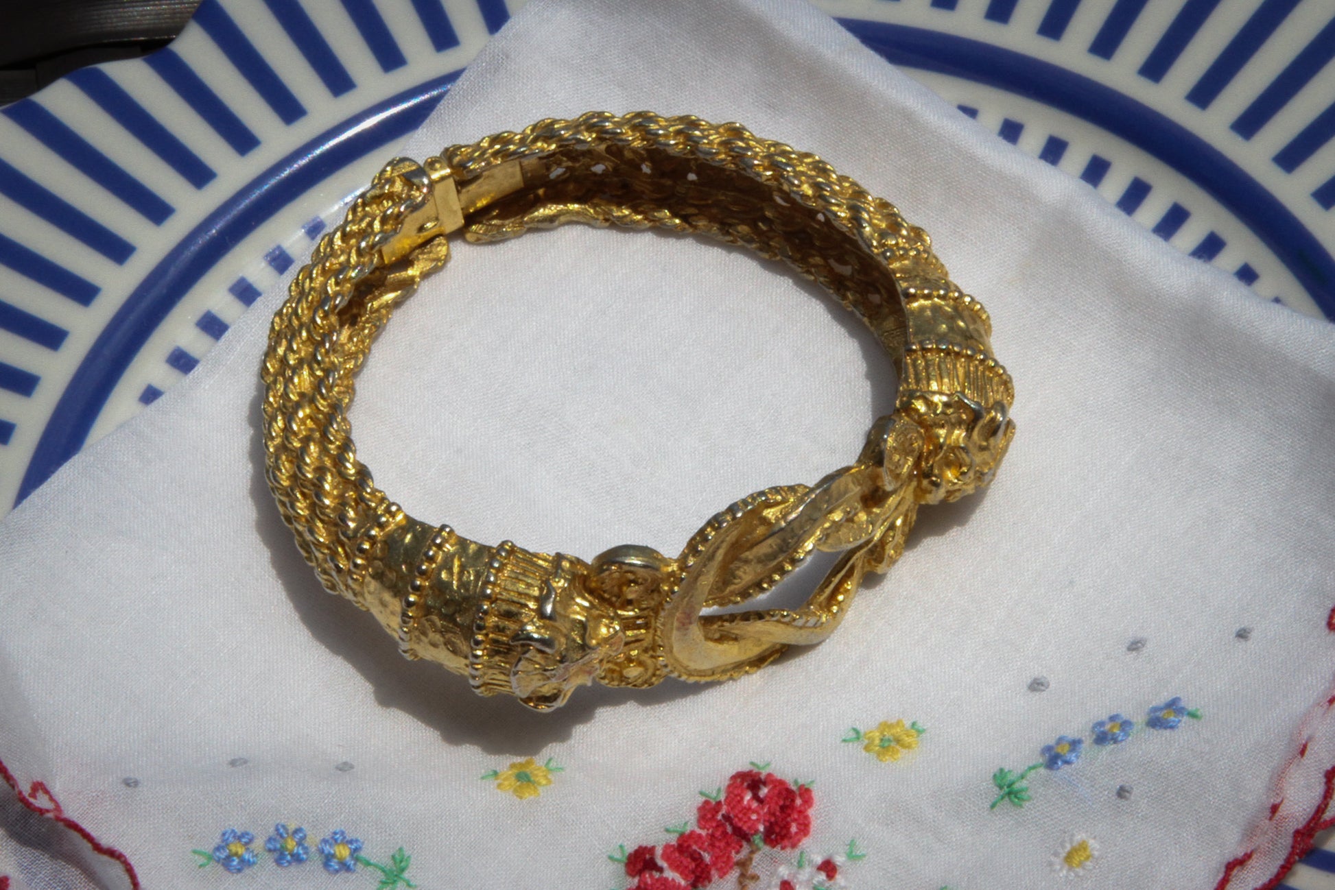 Command attention with this bold vintage lion head bracelet, a timeless symbol of strength and elegance. Crafted in the 1980s, this hinged cuff showcases a richly textured gold-tone braided band with ornate lion heads flanking a detailed hook clasp centerpiece. The craftsmanship and intricate detailing make it a standout piece in any vintage jewelry lover’s collection.