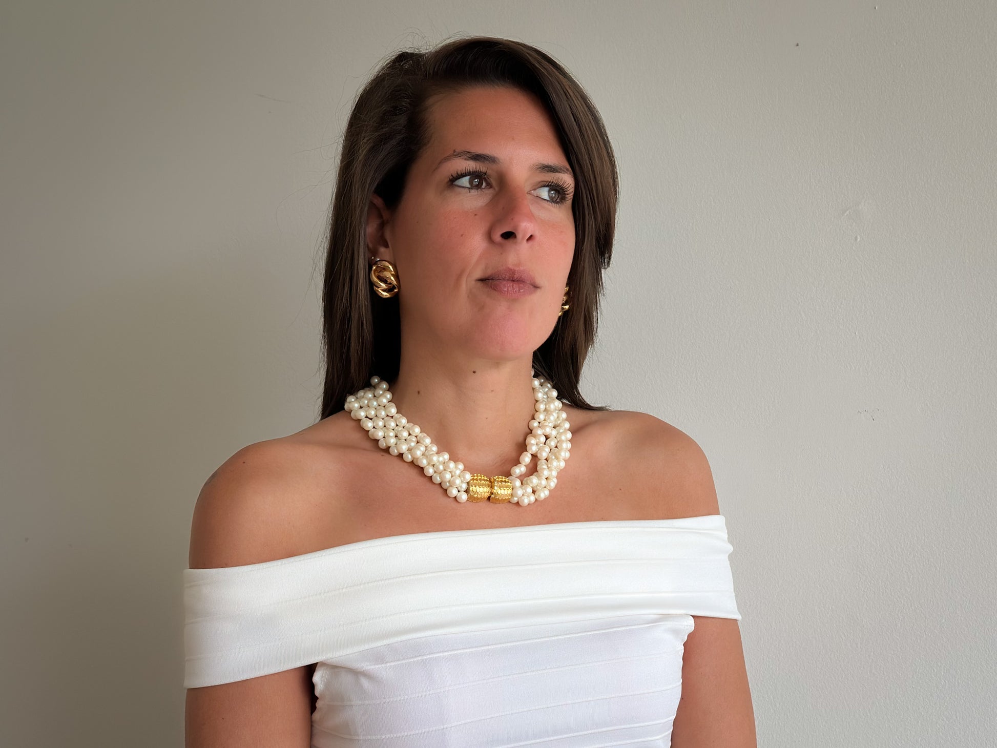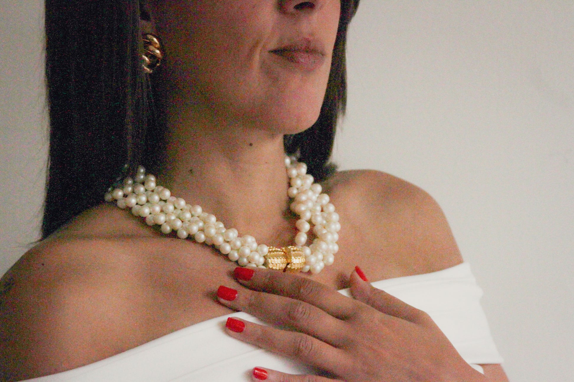 The necklace sits beautifully at the collarbone, making it an ideal accessory for off-the-shoulder dresses or formal wear. Paired here with chunky vintage gold clip-on earrings, the look channels old Hollywood glamour with a contemporary twist.