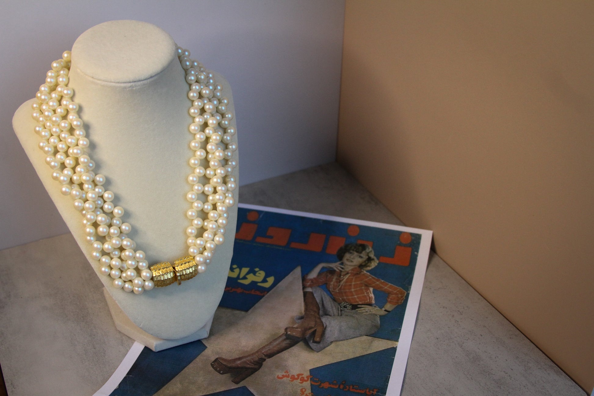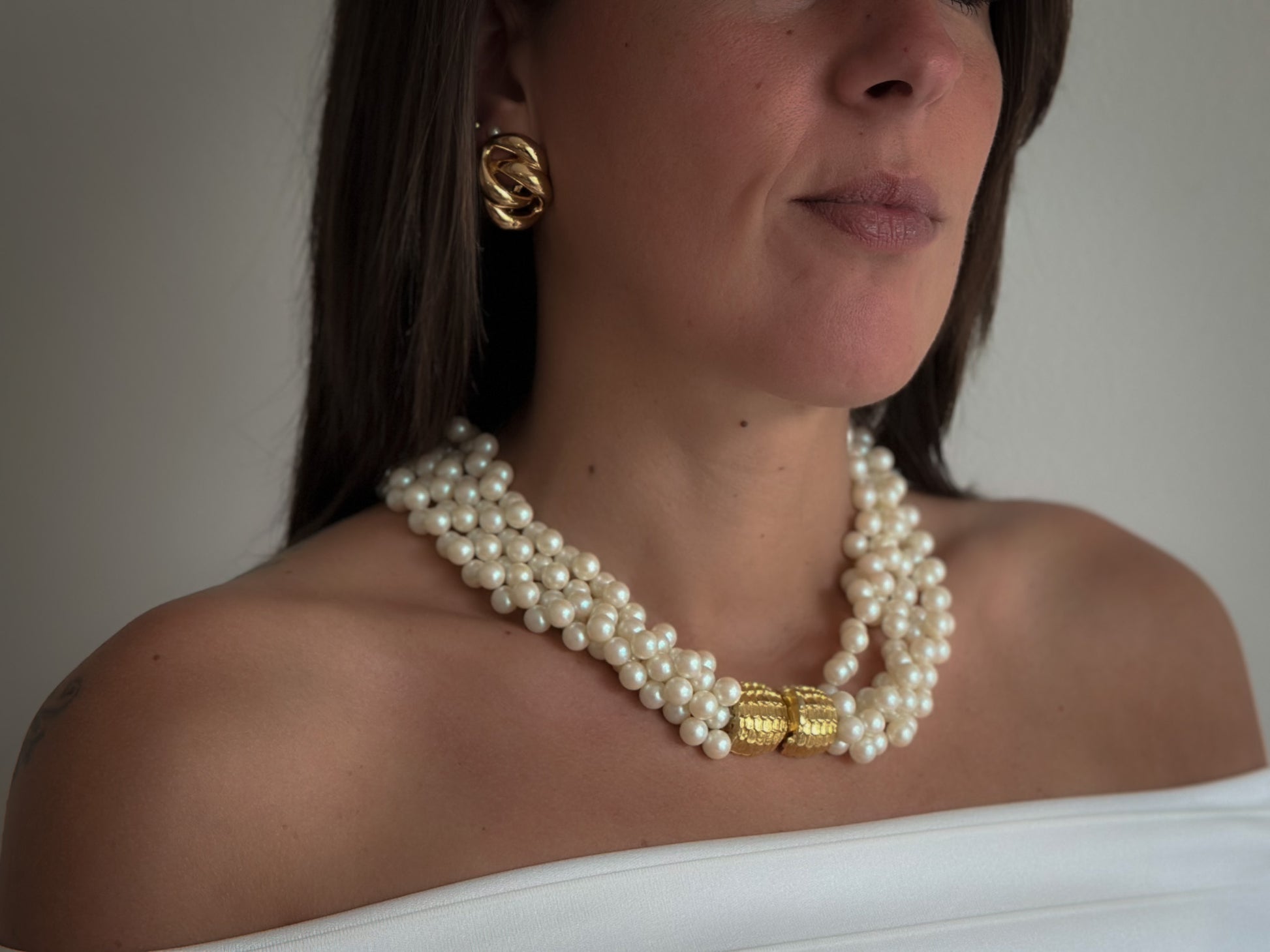 This striking vintage statement necklace features four strands of luminous faux pearls, elegantly twisted into a rope-like design. The strands are secured with a bold, textured, gold-toned barrel clasp that adds a luxurious and timeless touch. The clasp itself is a focal point—engraved with a ribbed, almost architectural design that gives the piece a refined, high-end feel.