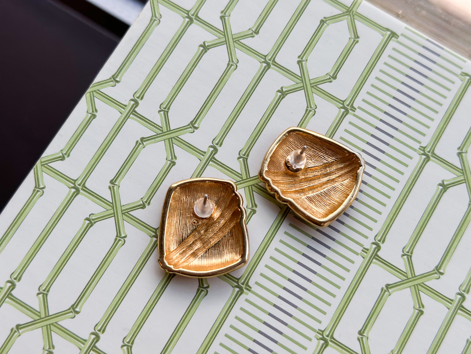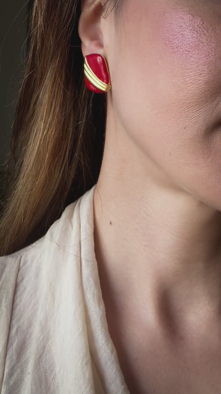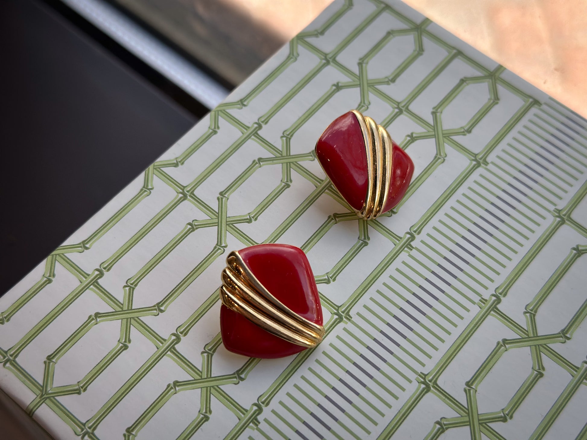 Make a vibrant impression with these eye-catching vintage earrings from the 1980s. Featuring a striking red enamel finish set in a gold-tone abstract frame, these post-back earrings are the perfect accessory for a pop of retro glamour. The dynamic layered stripe design adds movement and dimension, while the bold triangular silhouette is unmistakably '80s chic. Lightweight yet impactful, they’re ideal for both casual and dressy occasions.