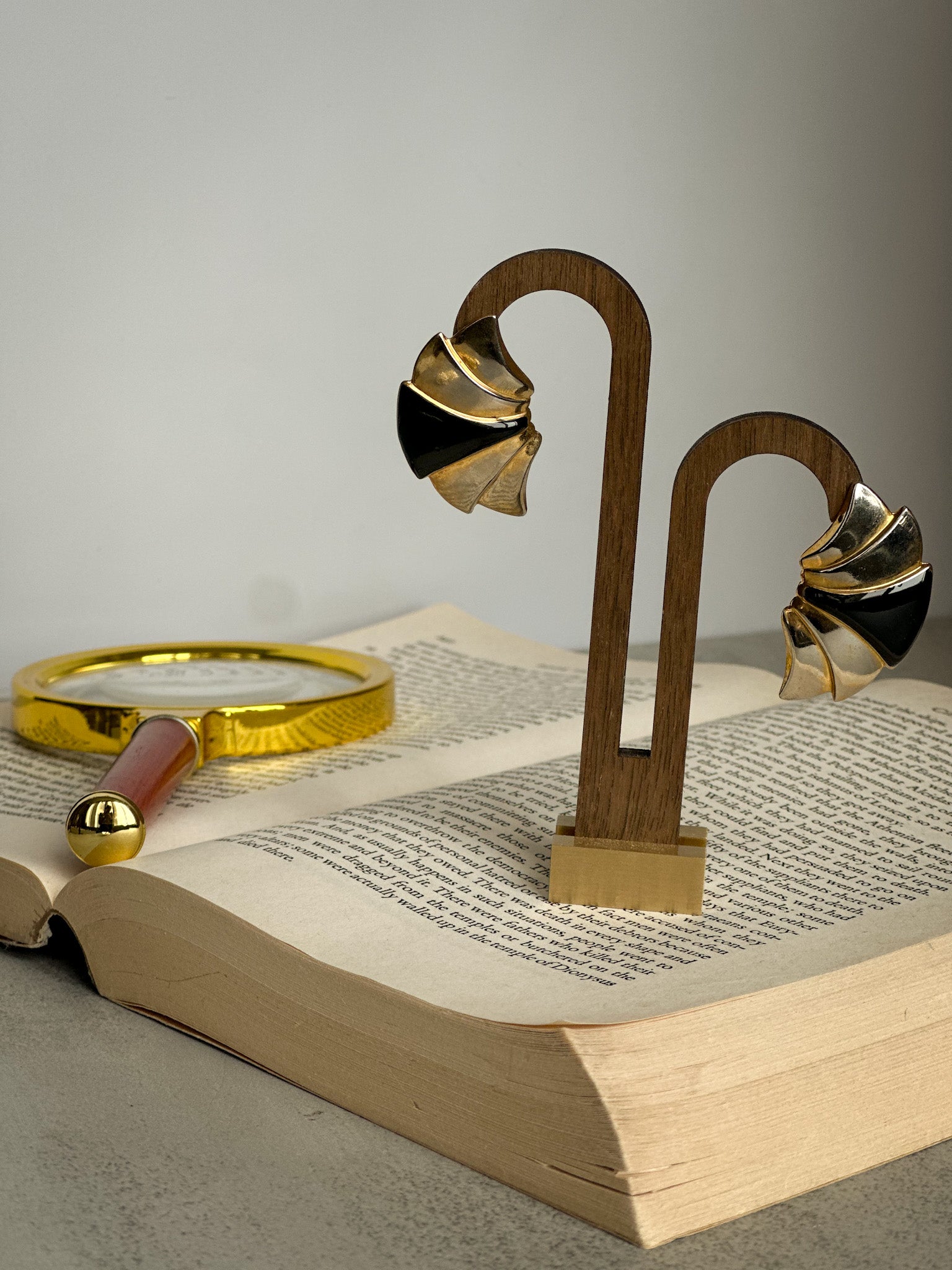 These striking vintage-inspired (pierced) earrings feature a sculptural spiral wave design with a bold contrast of glossy black and gold-tone segments. The fan-like curves create a dynamic, folded form that plays with light and shadow, giving the earrings a sense of movement and drama.