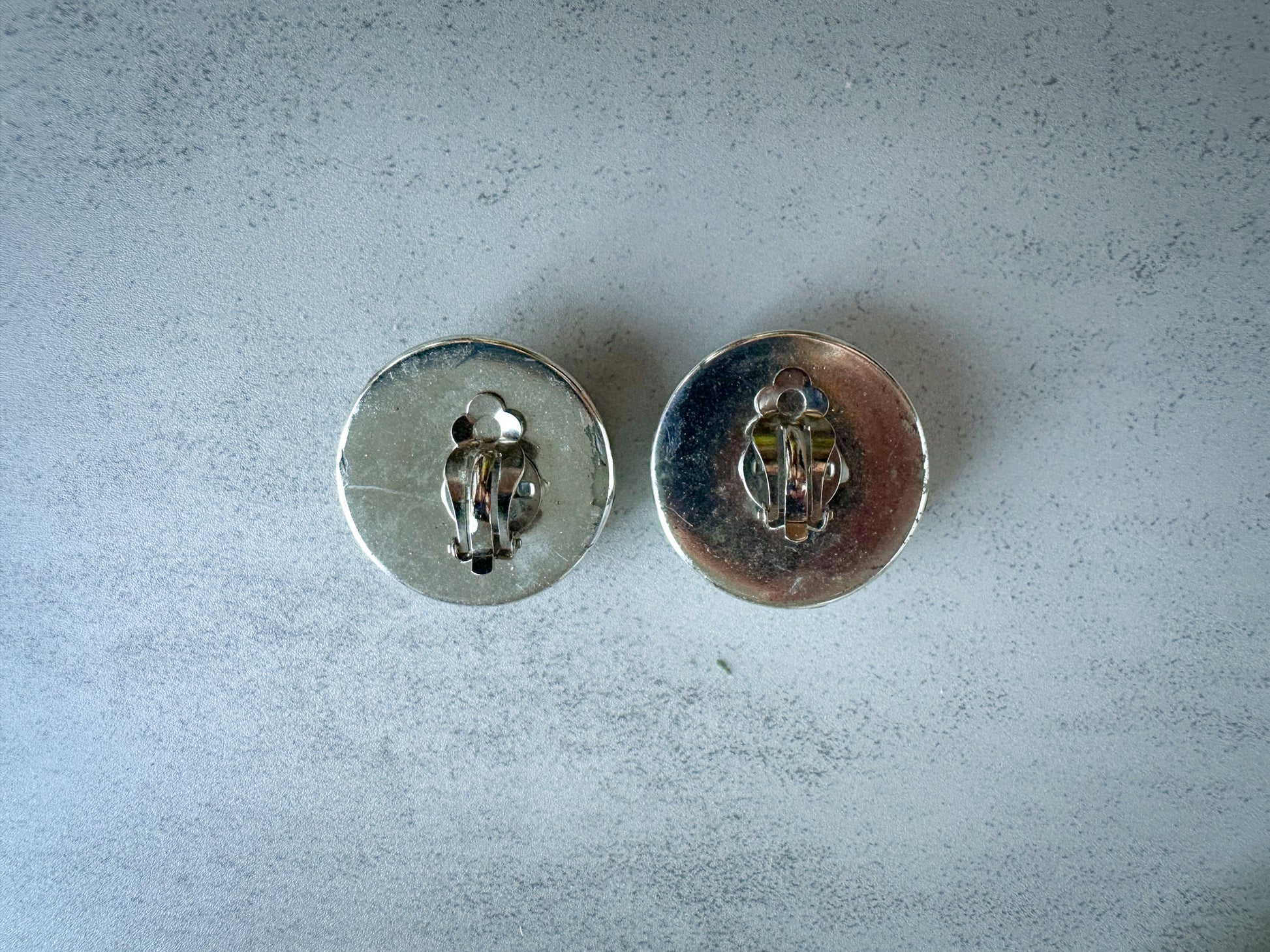 These silver-tone clip-on earrings feature a bold, medallion-style shape with intricate etched detailing inspired by tribal and bohemian motifs. The circular design includes concentric layers of engraved patterns and a raised center, creating an artisanal, high-impact look.