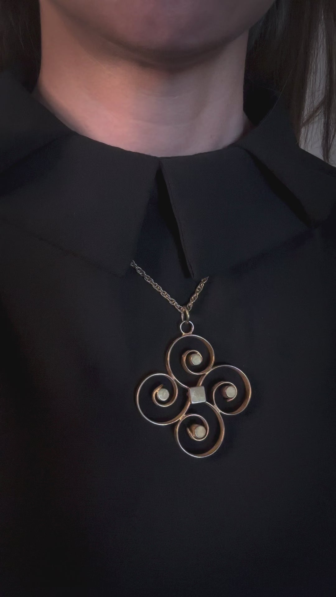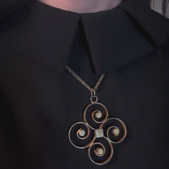 old yet timeless — this vintage 1970s pendant features sculptural spiral motifs forming a four-petal medallion design. Set on a twisted rope chain, its golden hue and dimensional form capture the glamour and artistic flair of the decade. Wear it with an open-collar blouse, a black turtleneck, or even layered over a dress for that effortless retro statement.